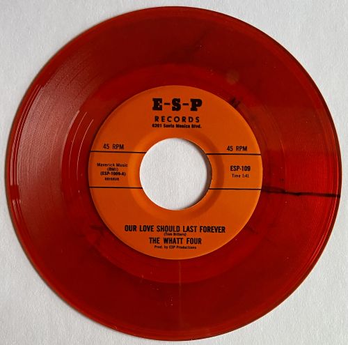 The Whatt Four released two amazing 45s in ’66 and ’67, both regional hits on KFXM in San Bernardino. This is the first one, with 2 original songs: Great harmonies and a driving bass line really propel the moody upbeat A-side, backed with a raver!